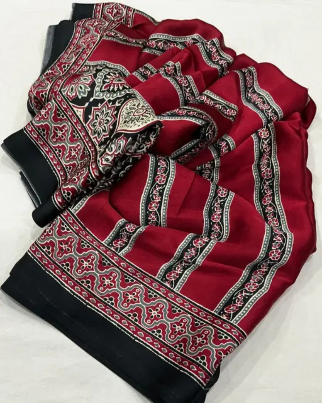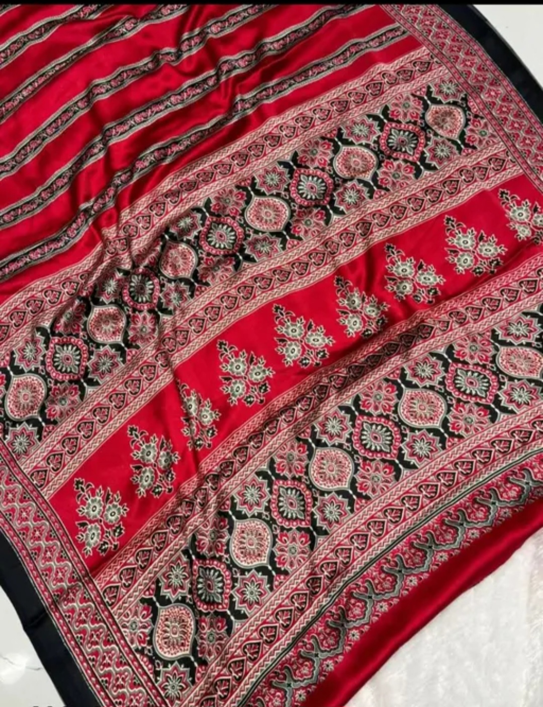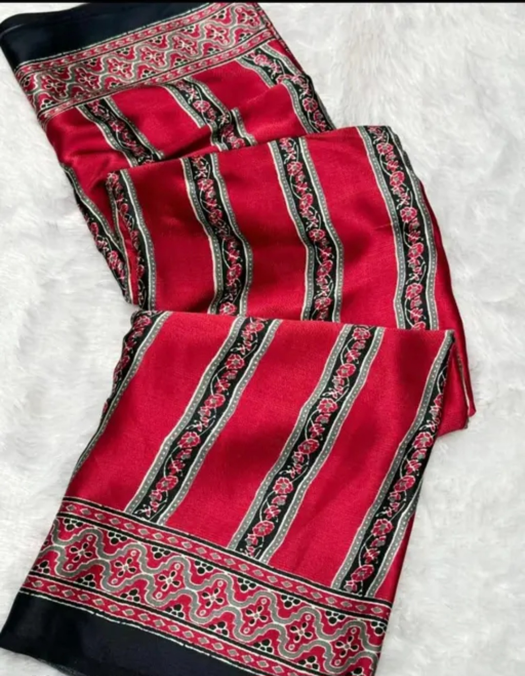 The Ajrakh Beautiful Design Saree is crafted in premium Satin Silk, featuring elegant striped patterns with a coordinated border design. The smooth satin finish gives a luxurious shine, making it ideal for festive wear and special occasions.