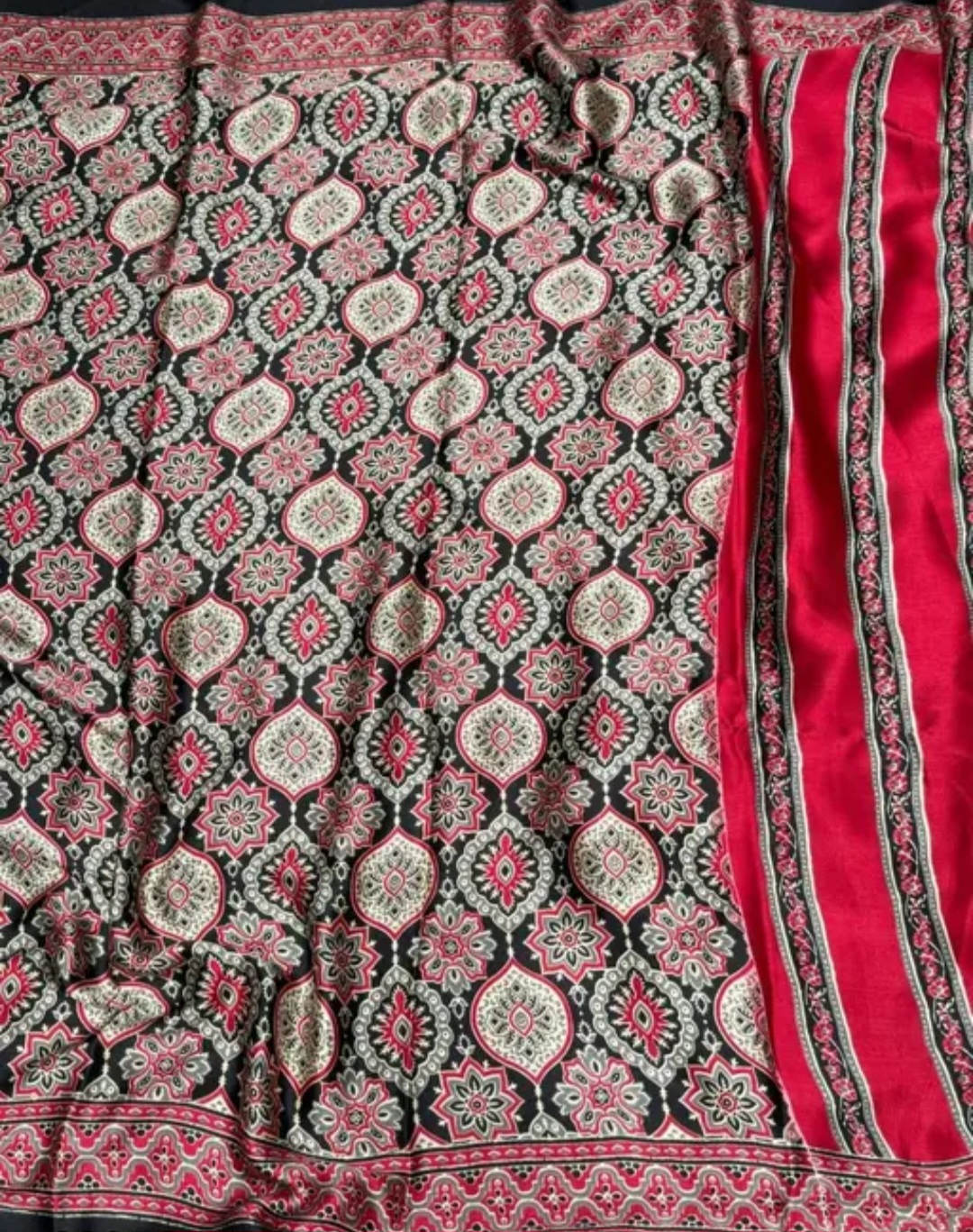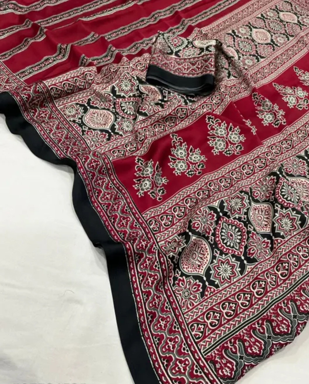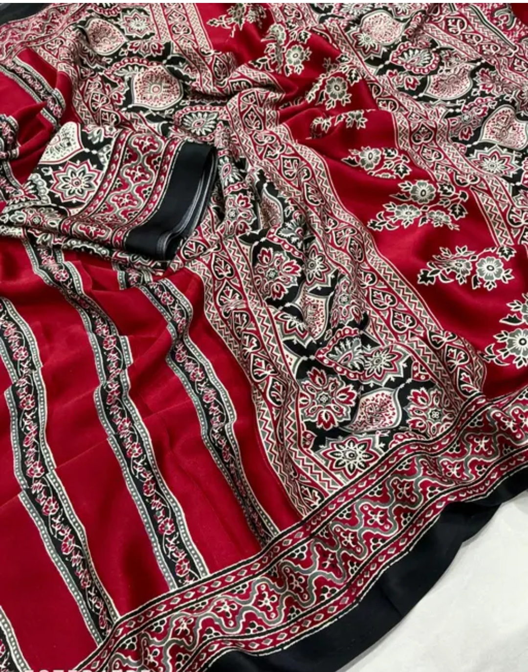 The Ajrakh Beautiful Design Saree is crafted in premium Satin Silk, featuring elegant striped patterns with a coordinated border design. The smooth satin finish gives a luxurious shine, making it ideal for festive wear and special occasions.