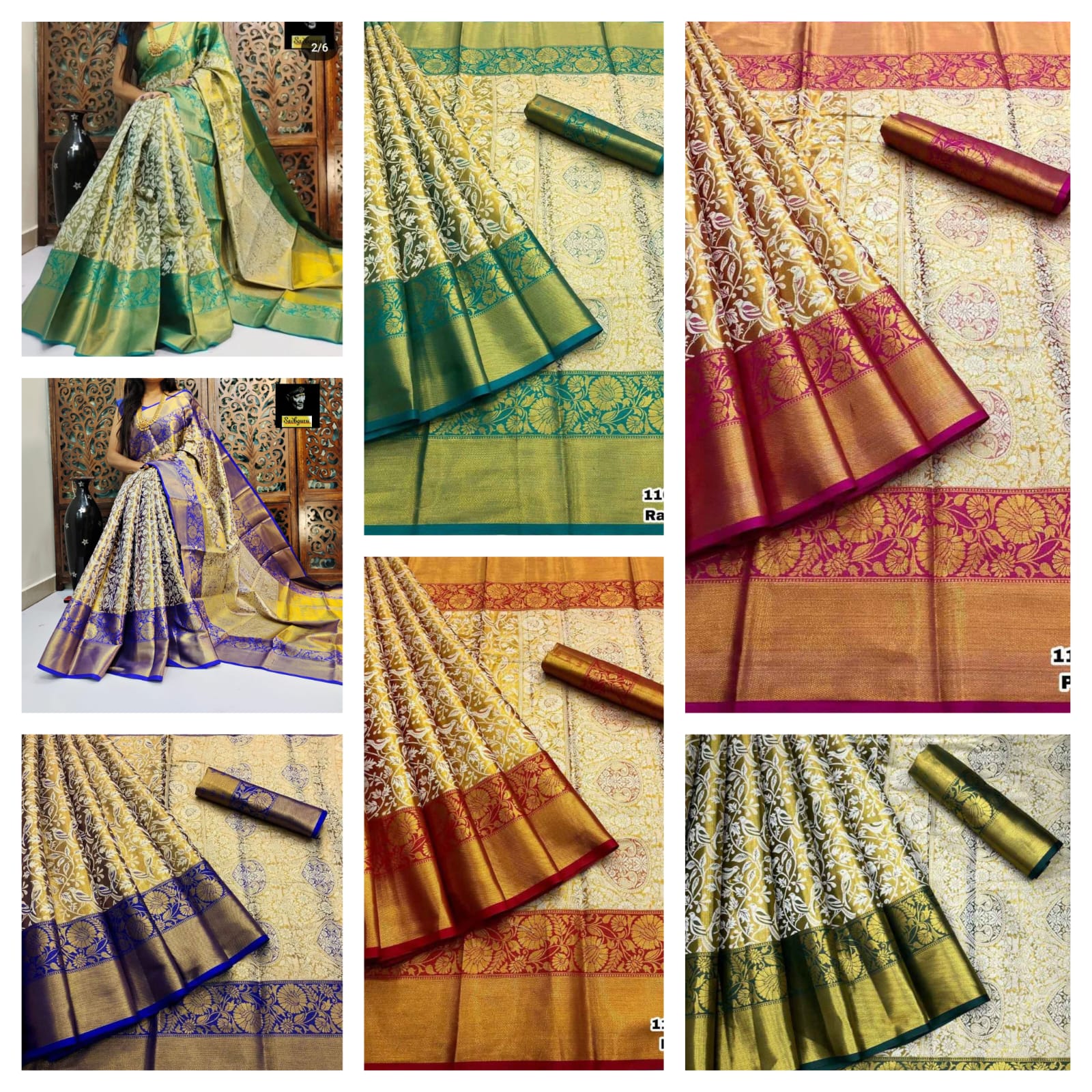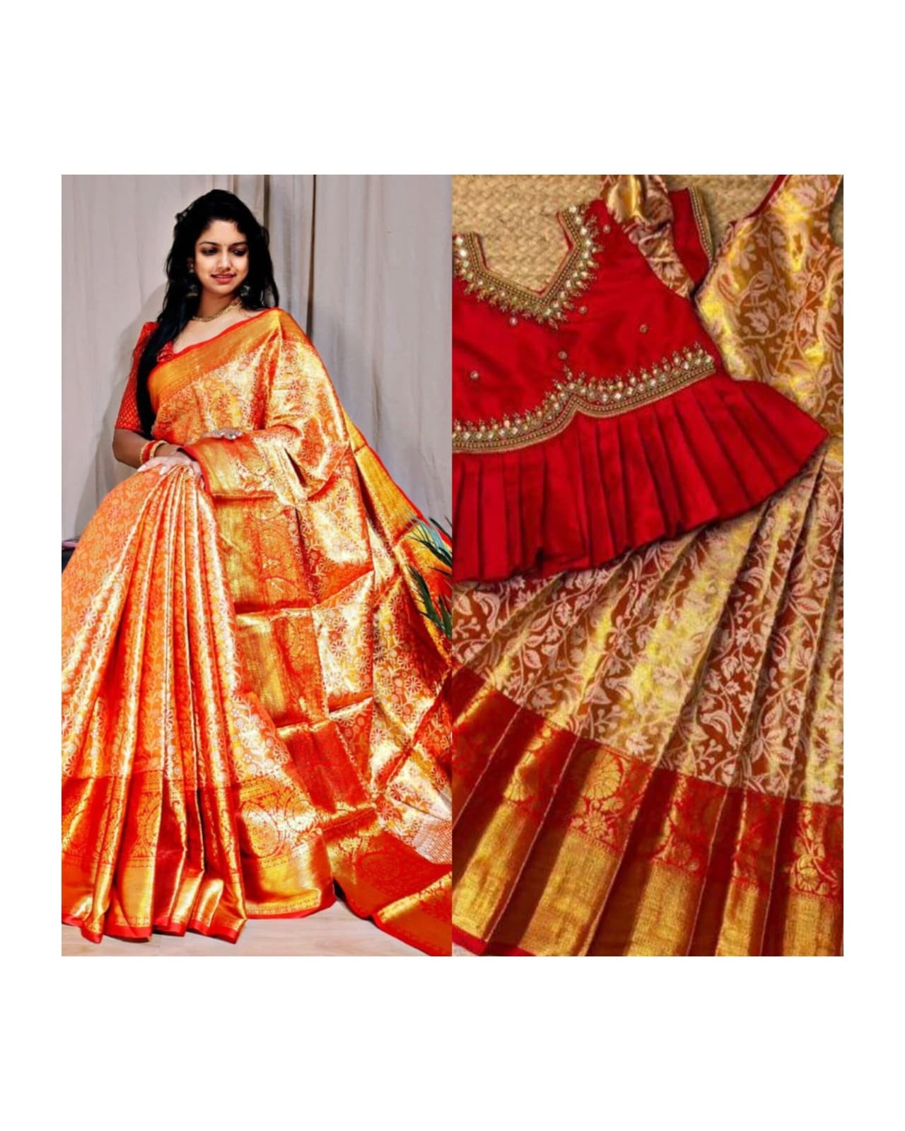 The saree is crafted in Semi Kanjivaram Silk with heavy mina weaving body, enriched with soft nylon zari and contrast gold zari rich weaving pallu. A beautifully designed contrast weaving brocade blouse completes the royal look.