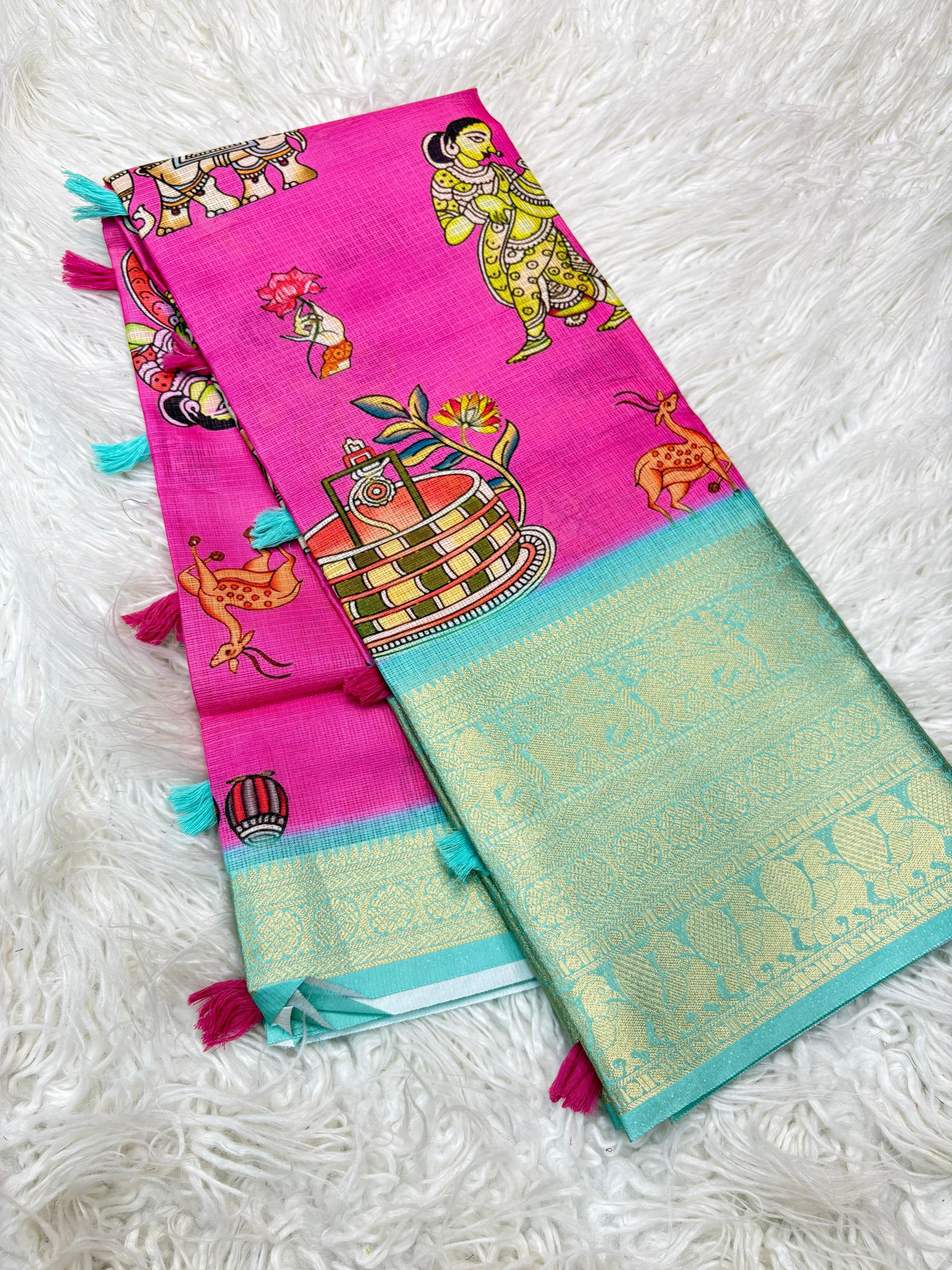 The highlight of this saree is its beautiful digitally printed Kalamkari pallu, inspired by heritage motifs and finished with a contrast matching border and elegant tassels for a graceful drape. Paired with a Kalamkari matching blouse, this saree is ideal for parties, festive gatherings, cultural events, and special occasions.